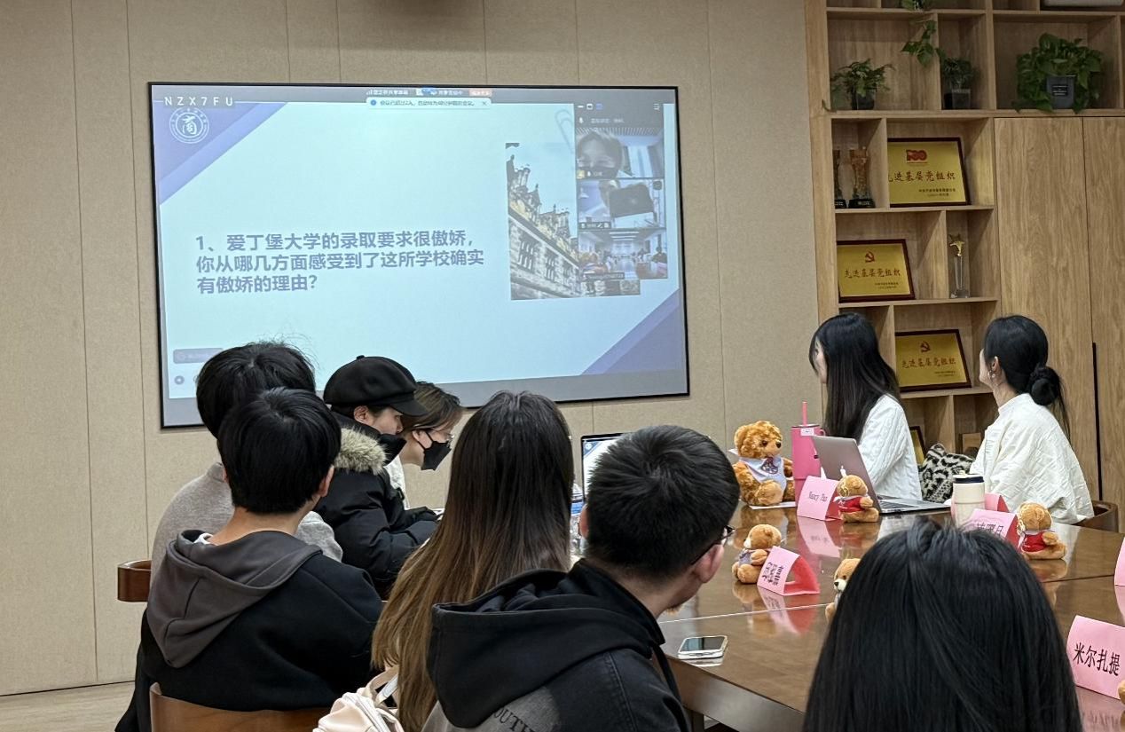 首先,通过线上连线,目前就读于爱丁堡大学的2025届全英金融专业学子徐柯,以轻松幽默的方式带领同学们“云体验”英国留学的真实日常。他详细介绍了爱丁堡大学浓厚的人文学术氛围、课堂互动模式以及跨文化学习中的收获与挑战。徐柯还通过图片与故事,分享了爱丁堡这座历史名城的建筑风貌、自然景观与节庆文化,并结合自身经历讲述了留学期间的生活趣事和社交体验,让在场同学对海外求学有了更具体、更温暖的想象。