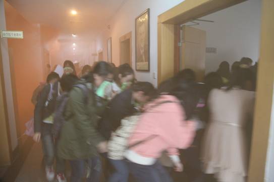在消防安全演习正式开始之前,保卫处徐作义老师为同学们讲授了掌握消防知识的重要性、基本的消防知识以及火灾发生时应如何逃生并且指导如何使用灭火器等消防工具。随后,进入消防实践演习的环节。工作人员拉开烟雾弹,警报哨声随着烟雾响起。橘色烟雾在过道中迅速弥漫开来,同学们迅速、有序地从安全通道逃离。在演习过程中,同学们均按照之前所讲解的方式“毛巾(手帕)捂口、低头、猫腰、小步、快走”进行有效撤离。当橘色烟雾充斥过道时,同学们都安全的离开了大楼。