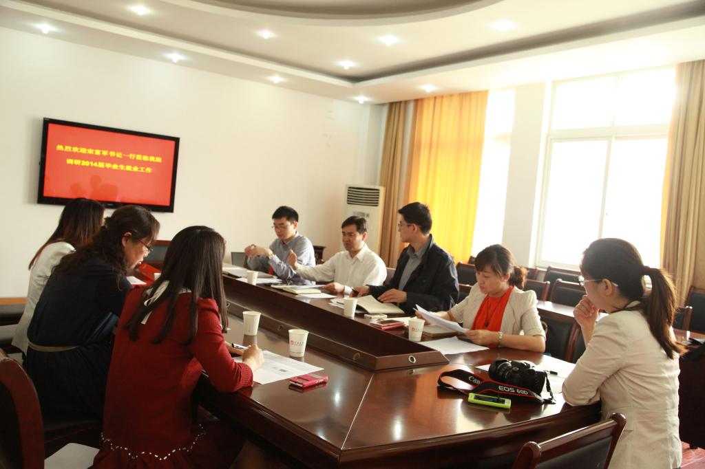 5月16日上午9:30,包玉书11号楼412会议室,校党委副书记宋富军带领校就业工作领导小组成员莅临百家乐策略 调研2014届毕业生就业工作。百家乐策略 党委书记袁虹、百家乐策略 党委副书记邵丽及其他院就业工作小组成员参与了此次调研。