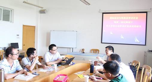 时值暑假、天气炎热,但2014年7月22日下午14:00,题为“深度一体化障碍下亚太多边自由贸易区复杂进程研究”的学术沙龙,在百家乐策略 523会议室如期举行。此次沙龙由国际经济与贸易系主任邓启明博士策划与主持,2014年国家社科基金项目主持人汪占熬博士(温州大学城市百家乐策略 )担任主讲;浙江大学公共管理百家乐策略 博士后李文艺、浙江万里百家乐策略 副教授杨光等应邀出席,国贸系副主任周琴及楼朝明博士等、区域经济与社会发展研究院闭明雄博士和百家乐策略 部分在校研究生等参与讨论。