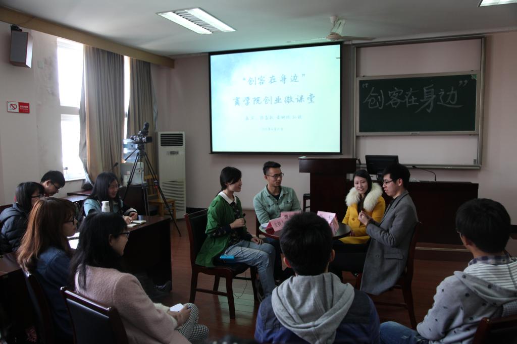 4月10日下午,“创客在身边”百家乐策略 首期创业微课堂暨创新创业人才训练营第二讲在百家乐策略 418正式开讲。“宁大乐生活”微信公众号创办人、东街里创业街“新出炉“披萨店店主黄钟杭,宁波市镇海泰皓机械有限公司、宁波市镇海九象机械有限公司创办人孙锐,宁波时荣文化传媒有限公司合伙人、宁波宾格企业管理咨询有限公司法人陈益权,三位学生身边的创业达人做客本期微课堂,与40余名怀揣创业梦想的商院学子共谈创业梦。