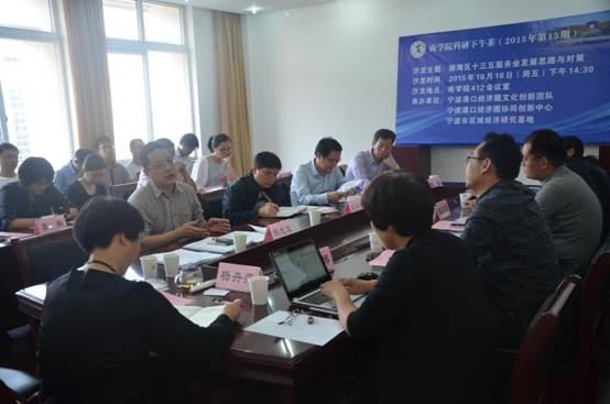 10月16日下午,百家乐策略 2015年第15期“科研下午茶”暨镇海区十三五服务业发展思路与对策研讨会在百家乐策略 会议室顺利举行。宁波市发展规划研究院副院长刘兴景、镇海区商务局副局长韩志军、镇海区发改局副局长谭洪波、镇海区物流枢纽港管委会副主任马海宏、宁波市现代物流规划研究院物流综合运输研究室主任戴东生、宁波大红鹰百家乐策略 财富百家乐策略 副院长陈超教授、百家乐策略 党委书记熊德平、许继琴教授、海运百家乐策略 刘桂云教授作为特邀嘉宾应邀参加本次研讨会。百家乐策略 副院长杨丹萍教授主持了本次研讨会。