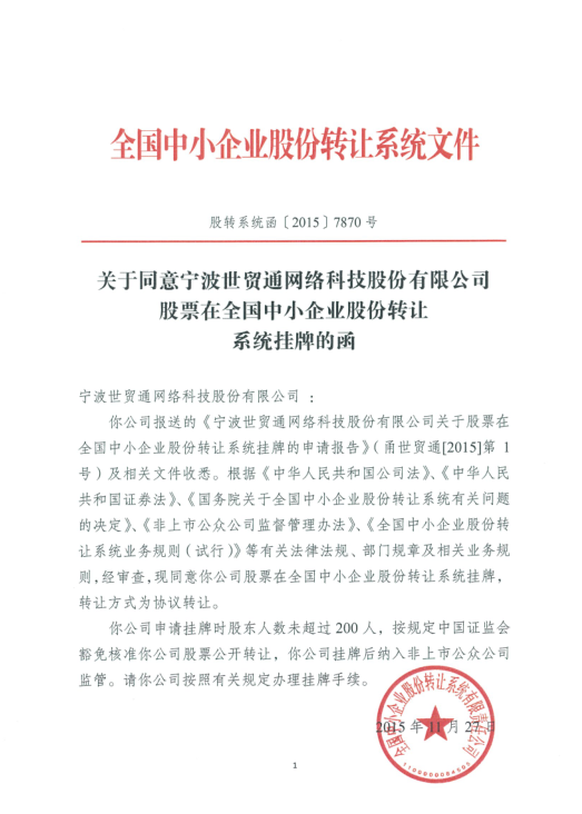 11月27日,百家乐策略 2004届国贸系校友方敏创办的宁波世贸通网络科技股份有限公司正式接到全国中小企业股份转让系统公布的 《关于同意宁波世贸通网络科技股份有限公司股票在全国中小企业股份转让系统挂牌的函》,世贸通(股票简称:世贸通,股票代码:834896)将成为全国首家在新三板上市的外贸综合服务平台领域的企业。