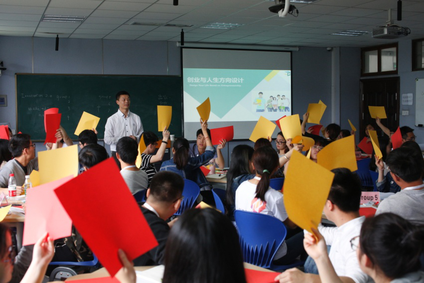 上午的课程分为两个模块:“课程导入”模块和“创业与人生方向设计”模块。“课程导入”模块,通过练习、提问、播放视频等方式加深同学们对创业的了解,并利用创业金字塔讲述大学创业教育体系,即了解创业、准备创业、创业实践,紧接着给出了学习目标、学习内容、学习思维工具和答辩要求。在“人生方向设计”模块,通过播放视频、提问等方式来启迪同学:越早找到方向,成就越大;同时,巧妙诱导同学制作行动计划,针对同学们出现的问题,提出评价与建议。