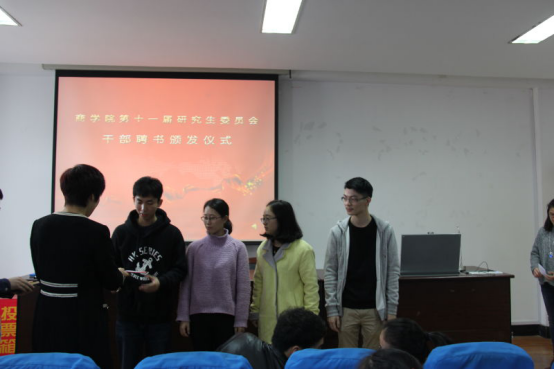 仪式上,邵丽、董璐、陈彬老师分别为主席团成员、各部门部长、副部长颁发聘书。邵丽老师在致词中对新当选的研会干部提出了批评、建议、期待与鼓励,勉励研会新干部要加强团队建设、积极办好各项活动的同时要提升自身能力。新任主席胡敏杰作为干部代表在发言中表示,新一届研会干部要做好内部建设和外部建设,群策群力,创新工作模式和活动形式,举办更多同学们喜闻乐见的高质量活动。