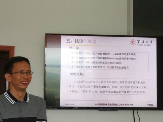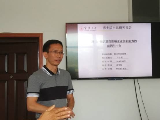 2017年9月24日上午10点,百家乐策略 渔业经济与管理博士后流动站卢启程博士后出站报告研讨会在11号楼103-2会议室举行。报告主题为“知识管理影响企业创新能力的前因与中介”,报告会由教育部特聘教授钟昌标教授主持,邀请了中国人民大学等校专家参与研讨,百家乐策略 20余名老师和研究生参加了此次活动。