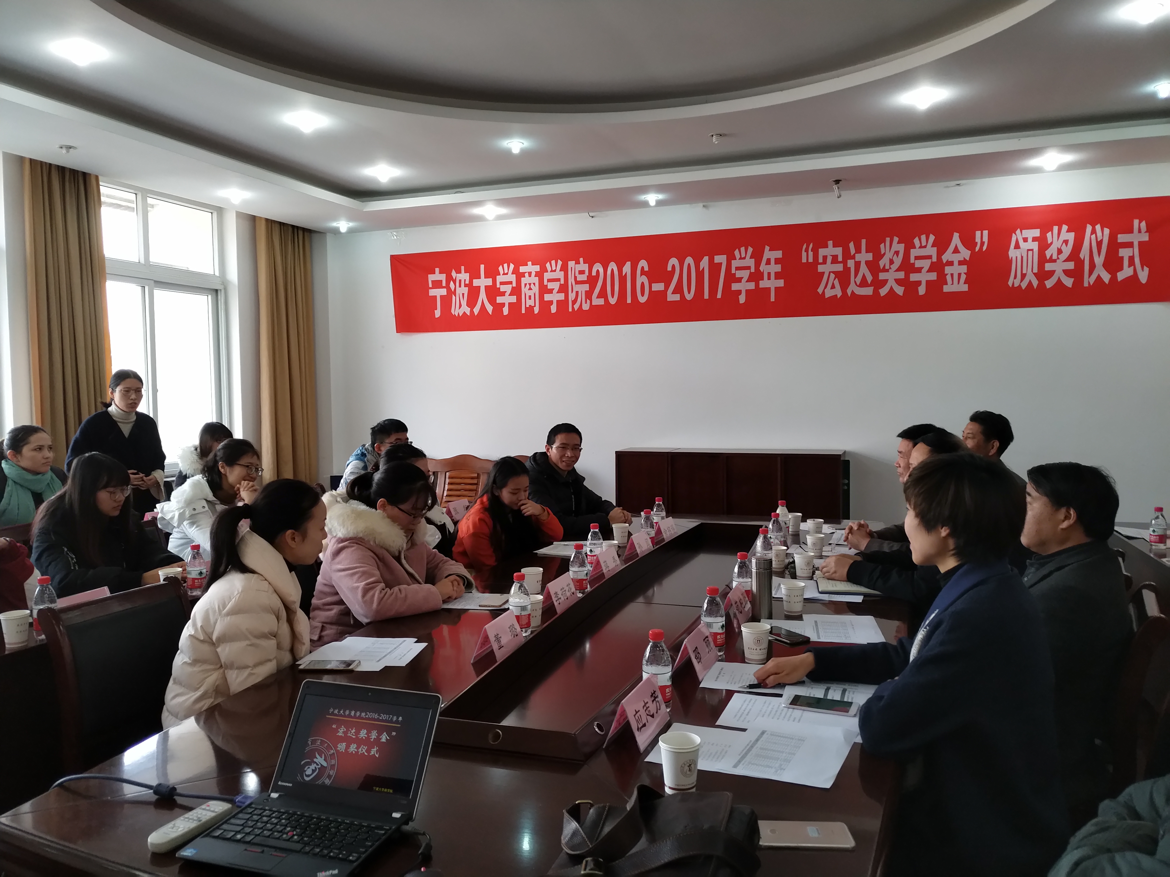 2017年12月9日上午,百家乐策略 2016-2017学年“宏达奖学金”颁奖仪式在百家乐策略 412会议隆重举行。宁波宏达货柜储运有限公司董事长陆汉幸、原宁波市北仑区王志明区长、原宁波市北仑区人大顾惠良副主任、百家乐策略 院长范柏乃、百家乐策略 工商管理系教师应志芳及16名获奖学生出席颁奖仪式。百家乐策略 党委副书记邵丽主持颁奖仪式。