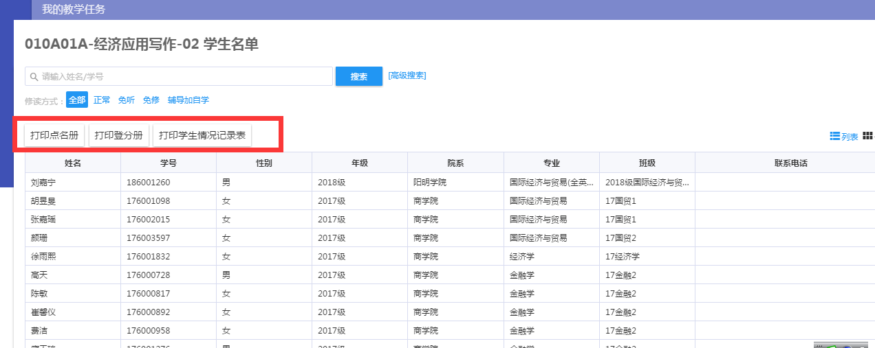 3、在我的教学任务中点击“学生名单”,可打印“登分册”、“点名表”和“课堂情况记录表”。