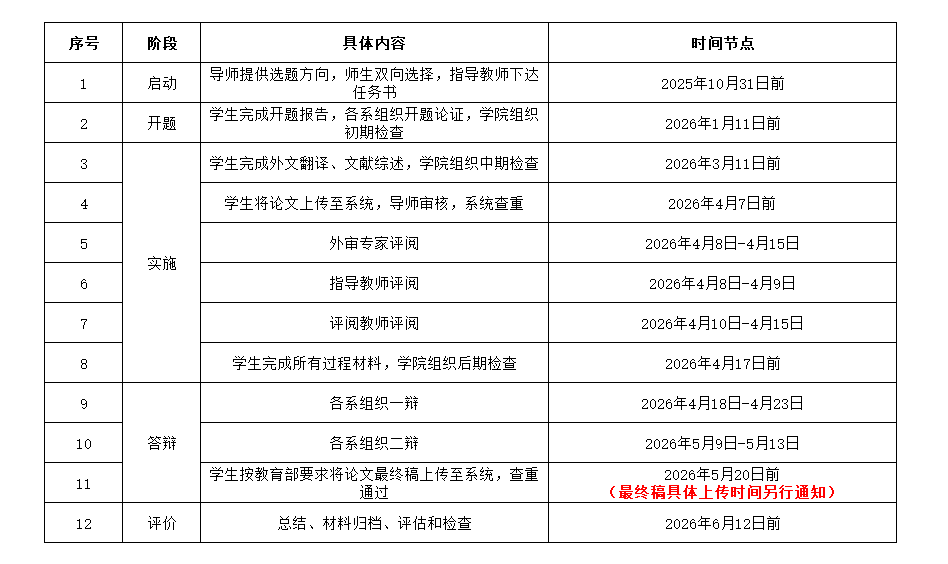 第二阶段(2026年4月7日前):进行课题的实验、设计、调研及结果的处理与分析等,完成毕业论文写作、审阅和修改完善,在2026年4月7日前学生将符合要求的毕业论文上传系统,导师审核通过后完成查重。指导教师审核不通过、论文查重不通过,直接进入“二辩”。