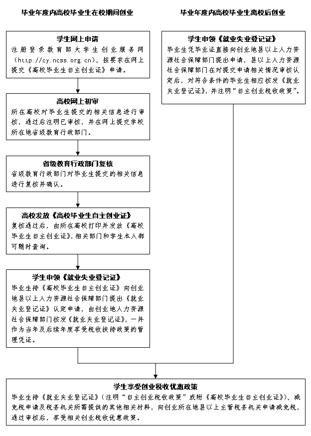 (二)毕业年度内高校毕业生在校期间创业的,可持《高校毕业生自主创业证》向创业地县以上人力资源和社会保障部门提出认定申请,由创业地人力资源和社会保障部门核发《就业失业登记证》,一并作为当年及后续年度享受创业税收扶持政策的管理凭证。毕业年度内高校毕业生离校后创业的,可凭毕业证书直接向创业地县以上人力资源社会保障部门提出认定申请。县以上人力资源社会保障部门在对有关情况审核认定后,对符合条件毕业生核发《就业失业登记证》,并注明“自主创业税收政策”。