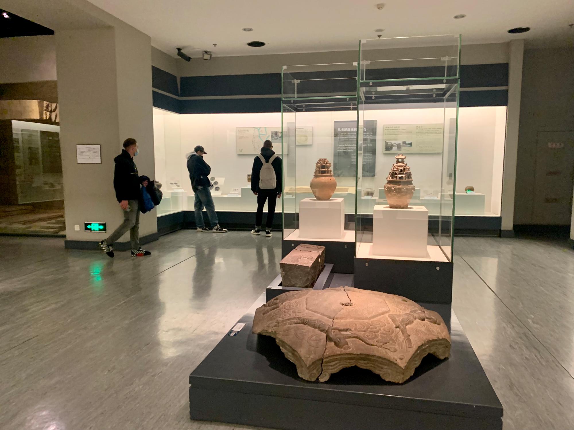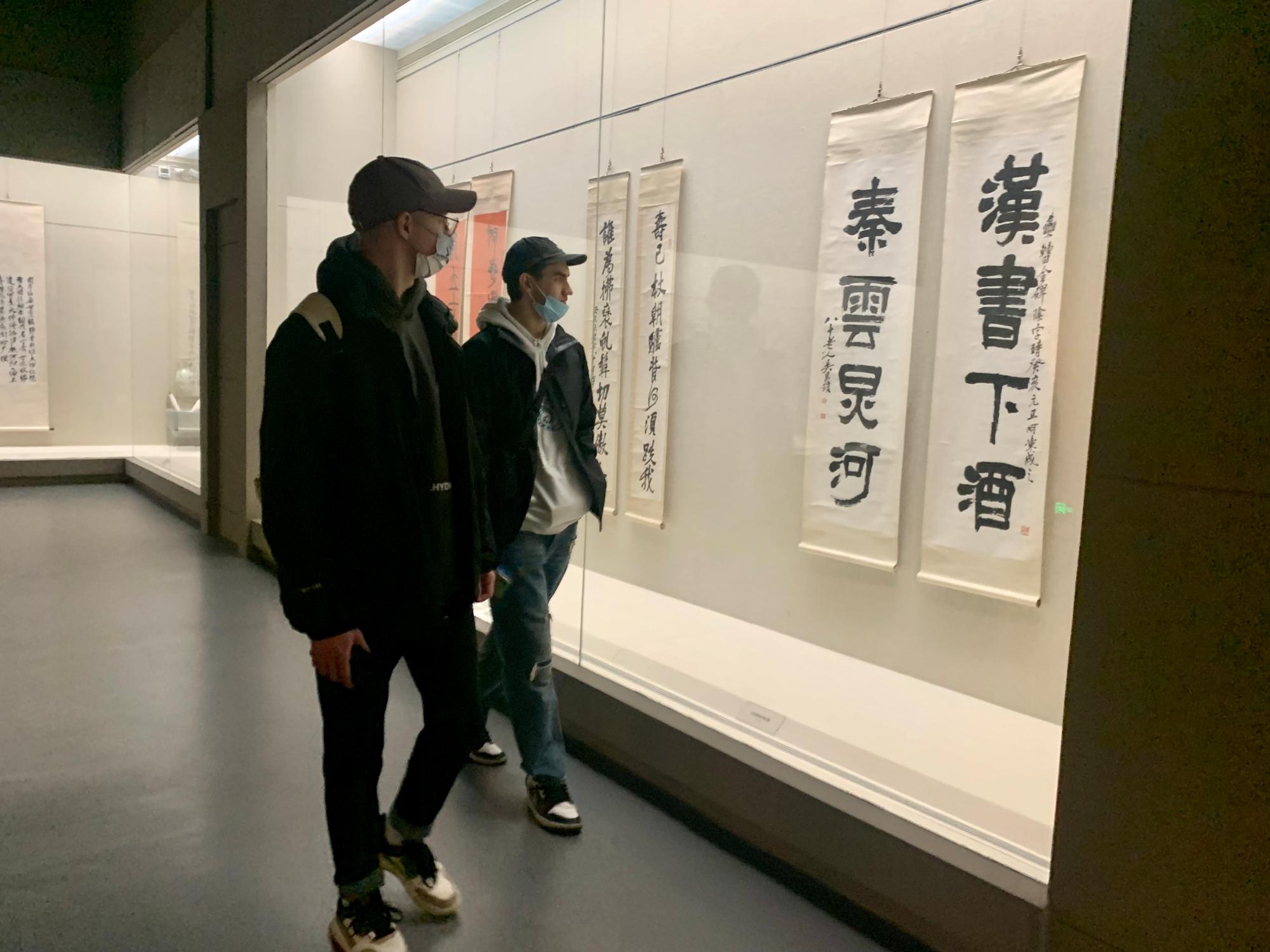 一楼两个展厅正分别在进行以中国古代饮食文化为主题的“食礼中华”展览,以及晚清著名国画家、书法家、篆刻家,首任“西泠印社社长”吴昌硕先生书画展。学生们通过展馆墙上的英文介绍,以及师生现场交流互动,理解吸收展览内容。随后,在二楼的宁波历史文化陈列馆中,学生们认真而详细地了解了宁波“河姆渡文化”的历史起源,以及宁波由秦汉至隋唐,乃至宋明之后的历史、文化、农业与商贸发展。在游览过程中,学生还偶遇了一群上海同济大学的留学生,双方进行了短暂交流。在三楼,众人参观了西藏历史文物珍品展。