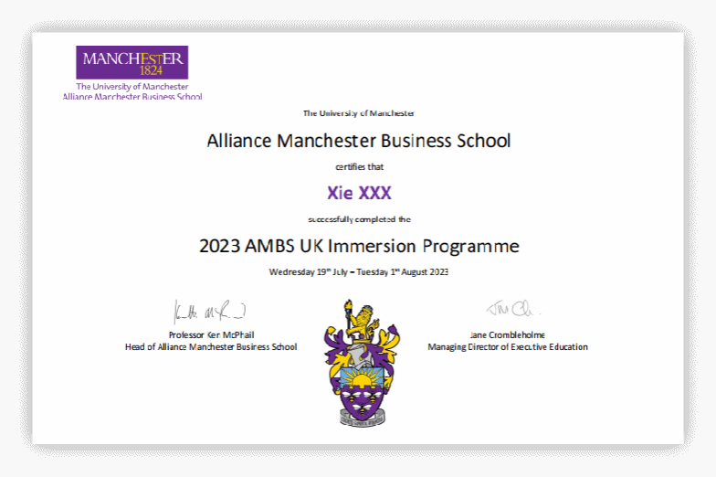 可获得曼切斯特大学百家乐策略 提供的官方成绩单与项目证书,表现优异的学生更有机会获得来自曼大百家乐策略 教授撰写的推荐信,高含金量的证明将助力学生未来的学业及职业发展。
