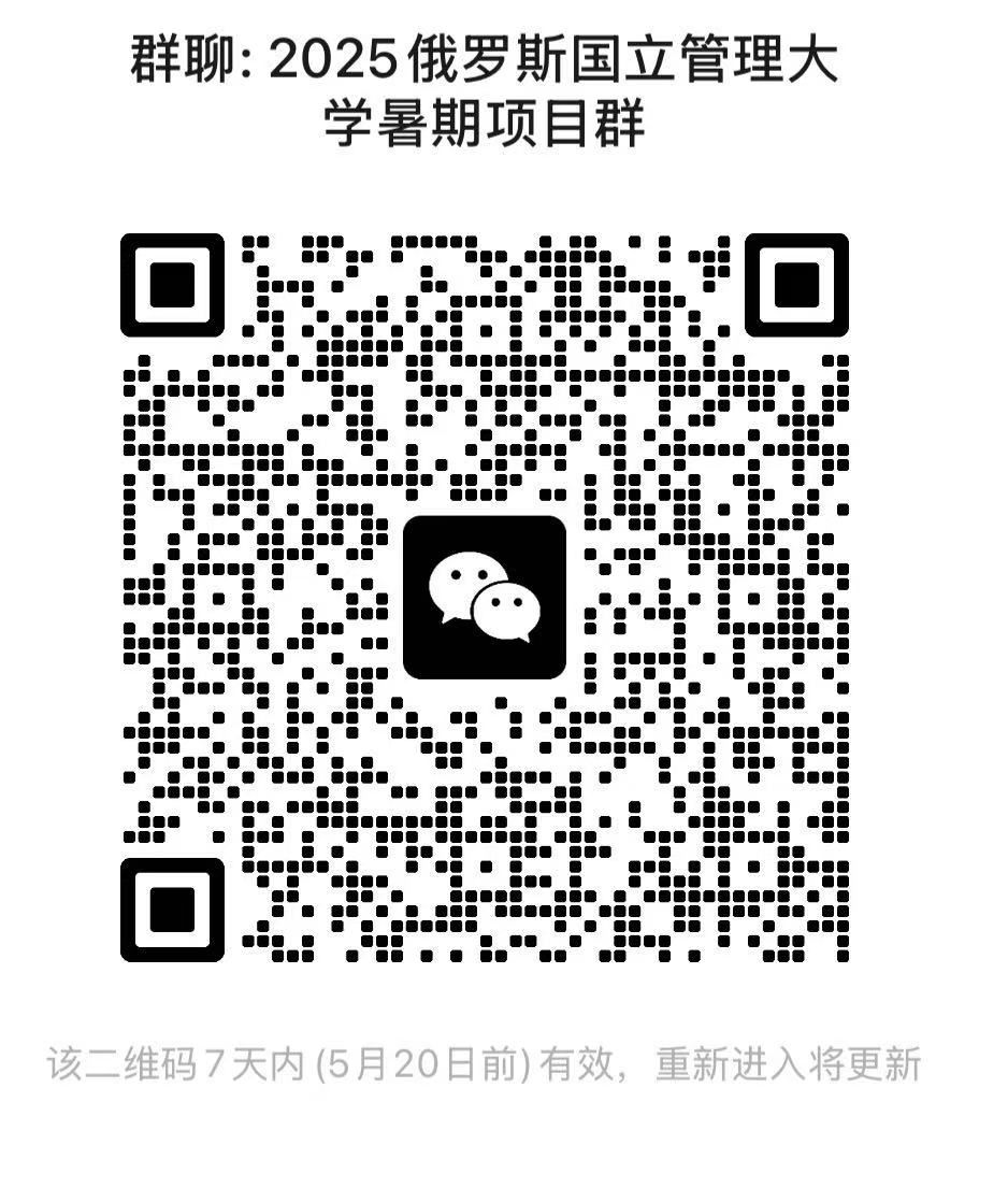 请感兴趣的同学扫码入项目群,并于5月20日前在学生出国系统里提交申请,选择:短期调研实习项目-院级项目-百家乐策略 -2025俄罗斯国立管理大学暑期项目。